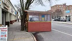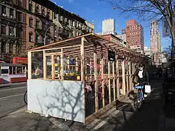 A dining shed is a makeshift outdoor dining structure created as a result of COVID-19 pandemic-induced government restrictions in New York City. After indoor dining was banned in the city in 2020 to prevent the spread of the illness, more than 12,000 dining sheds were hastily built by restaurants throughout the city using curbside parking space as a result of the Open Restaurants Program, which was authorized by then-mayor Bill de Blasio. The sheds are credited with saving numerous restaurants from closure, but were controversial due to noise pollution, abandonment, attracting crime, and taking up usable parking space, and much debate arose over whether to keep them after the pandemic had waned. While numerous problematic sheds were demolished by the city in the years following the height of the pandemic, a vast number remained in use until new regulations began in August 2024, resulting in the removal of almost all dining sheds in the city.