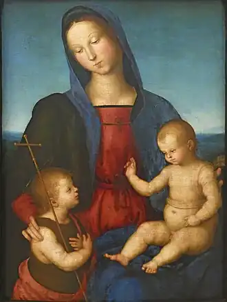 The 'Diotallevi Madonna is an oil on panel painting by Raphael, created c. 1504. It is held in the Bode Museum, in Berlin, where it entered in 1841-1842 from Marquess Diotallevi's collection in Rimini.[1] Previously attributed to Raphael's teacher Perugino, almost all art historians now attribute it to Raphael, with the exception of Adolfo Venturi who attributes it and parts of Perugino's Madonna della Consolazione to an anonymous, "Master of the Diotallevi Madonna".[2]