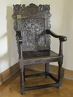 Examples of surviving furniture considered to be of good provenance were drawn and published by John William Small, an architect and furniture-maker based in Stirling, as Scottish Woodwork of the Sixteenth & Seventeenth Centuries (Stirling & London, 1878).[14] Towards the end of the 19th-century, a fashion for "oak rooms" loosely based on historic interiors, was supplied by new reproduction pieces, some supplied by Small's workshop in Stirling, the North British Art Furniture Works.[15]