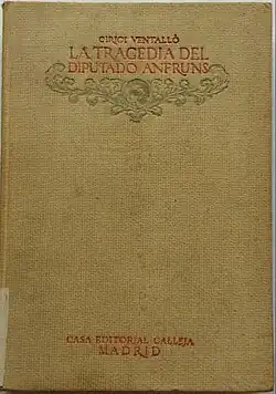 La tragedia del diputado Anfrúns[84] was first serialized in El Debate from January to May 1917, later that year released also as a book. Cirici remained within the limits of militant political fiction, though this time the plot was set not in the future but in the recent past. The novel focused on Catalonia; Cirici's venom was intended, apart from his usual liberal-republican enemies, also for the Catalanists, all indulging in corruption and caciquismo.[85] The novel tells the story of a young Liberal political hopeful. His cynicism and wit earn him first a place in the Barcelona ayuntamiento and then in the Cortes, let alone millions of a cleverly married girl from a Mexico-based indiano family. However, he is eventually outsmarted by equally cynical collaborators and malicious wife; Anfrúns dies when involved in half-legal war supplies to the French army. Like in Memorias the key protagonist was a fictitious character interfacing mostly with real-life personalities; apart from the customary black characters of Lerroux or Romanones,[86] this time they included many Catalans like Comas y Masferrer, Cambó and Planas y Casals.[87]