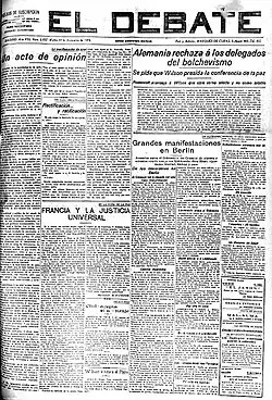 Apart from his Correo assignment in the 1910s Cirici contributed to many mostly provincial and usually Carlist, conservative or at least Catholic dailies, especially Diario de Valencia[57] and El Norte from Girona;[58] the others were La Independencia from Almería,[59] El Restaurador from Tortosa,[60] El Pueblo Manchego from Ciudad Real,[61] La Gaceta de Tenerife,[62] Heraldo Alaves,[63] El bien público from Mahón[64] and La Tradición from Tortosa; less frequently his writings appeared in at least 20 other titles[65] and in papers published in Latin America.[66] In 1912–1913 he also managed ephemeral satirical weeklies El Mentidero and El Fusil.[67] Already as a star of journalism starting 1917 Cirici signed an exclusive contract with El Debate[68] and almost ceased publishing elsewhere. Though still redactor-jefe of Correo,[69] he became the most recognized pen of Herrera Oria’s newspaper; apart from commentaries he worked as envoy[70] and interviewed key politicians, e.g. Antonio Maura.[71] Last but not least, Cirici became one of key persons behind the Madrid professional corporation, Prensa Asociada.[72]