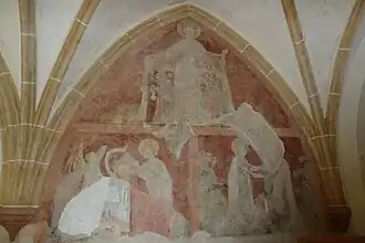 Vault is cross like in the church and ribs have similar profile as the ribs in the church. Brackets in inner side of cloister are simply formed without decoration; we can also find atypical supports with vegetable motives. In the court direction the arc is supported by two columns with heads decorated by vegetable motives. In other corners pillars with undecorated heads step 10 cm in space. Each bay of the vault between ribs was decorated as well as walls. The most valuable wall-picture is located in the cloister and shows Holy Virgin, the patron of České Budějovice, who hides real figures of the emperor Charles IV, Holy Roman Emperor and his son Wenceslaus IV of Bohemia under the open coat. Painting dates back probably to 1378. Between 5 and 7 May 1378 the emperor Charles IV with his 17-year-old son spent their time in the royal town České Budějovice where they were attending meeting with Czech aristocrats, ecclesiastics and the nobleman of the Holy Roman Empire. It is also necessary to mention well-preserved gothic extension above well called "Well Chapel" in southern part of cloister.