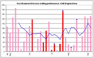 Bradman had almost opted out of the tour, citing business commitments in Australia; at the time, it was not possible to make a living from cricket.[2] Prior to the campaign in England, Australia hosted India for a five-Test series during the southern hemisphere summer of 1947–48. Australia easily defeated the tourists 4–0, and Bradman and his fellow selectors Chappie Dwyer and Jack Ryder thus began planning for the tour of England. Bradman made it publicly known that he wanted his team to become the first to play an English summer without defeat. England had agreed to make a new ball available every 55 overs, instead of the previous rule of after 200 runs had been scored.[3] As the run rate was generally much slower than 3.64, 55 overs would usually elapse long before 200 runs were scored.[4][5][6][7][8] This meant that the ball was in a shiny state more often, and thereby more conducive to fast and swing bowling. Bradman and his colleagues thus chose the team with an emphasis on strong batting and fast bowling, basing his strategy on an intense speed attack against England's batsmen. His 17-man squad sailed for England and arrived in mid-April.[3]