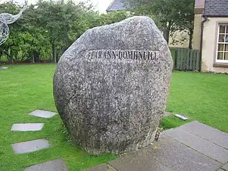 Stone outside the Store House of Foulis which includes a Clan Munro exhibition, reading in Scottish Gaelic: Fearann-Domhnuill meaning Ferindonald or Donald's land in accordance with the tradition of Donald Munro.