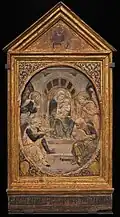 Paolo Schiavo, painted and framed relief after model by Donatello | Madonna and Child Between Angels, God the Father, Eve and a Crowned Prophet | tabernacle, relief | stucco (relief) in wooden framing, painted and gilded | 12.1 × 9.5 (relief) 36.5 × 20.2 × 5.2 |