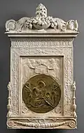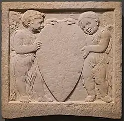 Donatello attributed or the model executed under his direction by the workshop of Desiderio and Geri da Settignano[30] | Coat of arms of the Martelli family | relief | sandstone (pietra serena), partly painted and gilded | c. 1455 | Florence, Bargello (Inv. 532 S) | |