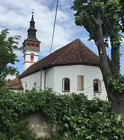 The church is typical of contemporary Transylvania architecture, a Gothic hall church inspired by the Transylvanian Saxons. It features an altar separated from the nave by an iconostasis, a vestibule with a spire, and a small entrance porch to the west. The main part is made of stone, the arches and spire of brick. The floor is around 80 centimeters below ground level. The soil is lower on the north side, suggesting the earlier presence of a cemetery.[1]