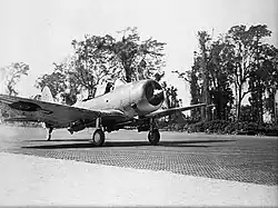 The next day, 27 March, was the squadron's first attack on Rabaul. Alongside No. 30 Squadron, which had arrived on Bougainville at the same time and used Grumman TBF Avengers torpedo bombers in a dive bomber role, the targeting of the airfields on Rabaul to prevent the resupply of the Japanese forces by air was the squadron's primary role for the bulk of its tour at Piva. The Avengers would bomb the airfields, usually those at Vunakanau and Tobera, while No. 25 Squadron's Dauntlesses would attack the anti-aircraft guns.[13][15] During its sorties the New Zealand aircraft usually were part of a larger formation, operating alongside aircraft of the USMC and USN. The squadron's attack of 27 March, which targeted munition supplies at Rabaul's Talili Bay, was a success.[19]