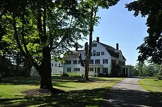 The Jackson House stands on the south side of Waldoboro Road (SR 32), just south of its junction with Maine State Route 126, in the village center of Jefferson. The property has shoreline on Damariscotta Lake to the south. It is a 3+12-story wood-frame structure, with a gambrel roof and clapboard siding. It is oriented with its main facade facing west, with a 2+12-story gambreled ell extending to the east. The main facade is symmetrical, with five bays. The central bay is in a projecting element that has a gambrel dormer with a Palladian window, and a band of three sash windows above the main entrance. The entrance is sheltered by a projecting flat-roof portico, supported by groups of smooth Doric columns. A similar portico adorns the north side of the house, and the side elevations have Palladian windows in the third level.[2]