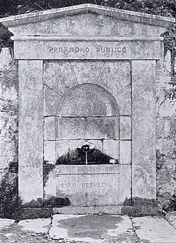 The first fountain, so called, stands upon the side of the road on the west side of the Wissahickon … It is claimed that this is the first drinking fountain erected in the county of Philadelphia outside of the Fairmount Water-Works. A clear, cold, mountain spring is carried by a spout, covered with a lion's head, from a niche in a granite front, with pilasters and pediment into a marble basin. The construction bears the date 1854 … Upon a slab above the niche are cut the words "Pro bono publico"; beneath the basin these, "Esto perpetua".[3]