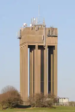The tower stands on top of Yew Tree Hill, to the south-east of the town of Droitwich Spa, and is visible from long distances.[1][2] It was constructed in 1962 by the East Worcestershire Waterworks Company to house a tank containing 150,000 imperial gallons (680,000 L) of water, to improve the local supply pressure.[1][3] The tower stands 110 feet (34 m) tall and was constructed by Currall, Lewis and Martin Ltd. for the cost of £35,000.[1][3][4] The tank is supported on 12 square columns, each 81 feet (25 m) high, around the perimeter of the square structure.[3][4] The columns are remarkable for their comparative slenderness.[3] A square service shaft in the centre passes through the tank to give access to the tank and roof.[3][4]