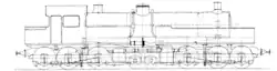 The du Bousquet design had an unusual wheel arrangement; both trucks had six driving wheels and two carrying wheels supporting the cylinders.[2] Unlike many other articulated designs, these carrying wheels were toward the center of the locomotive, as were the cylinders. This arrangement is expressed in the French classification as 031+130, in the Whyte notation as 0-6-2+2-6-0T, or in the UIC classification as (C1′)+(1′C) n4tv.