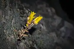 Dudleya cymosa subsp. marcescens is a species of summer-deciduous succulent plant known commonly as the marcescent dudleya or marcescent liveforever. Throughout the months of spring, it is characterized by a bloom of small, bright-yellow flowers with 5 petals, tinged with orange or red. It is a leaf succulent with a basal rosette, with the foliage withering in summer, going completely leafless, a neotenous trait in the genus.[2] This species is endemic to the exposed volcanic rock of the Santa Monica Mountains in California, being found on shady slopes and outcroppings.[3] It differs from its local congeners with its deciduous habit, slender caudex, and narrower leaf shape, although it is superseded in some of these characteristics by Dudleya parva, growing 13 km to the north, which has even narrower leaves and is quicker to lose them.[4] Because of its restricted distribution and small size, it is vulnerable to habitat degradation and disturbance from acts of graffiti and rock climbers.[5] It is listed as threatened by the United States Fish and Wildlife Service.[6]