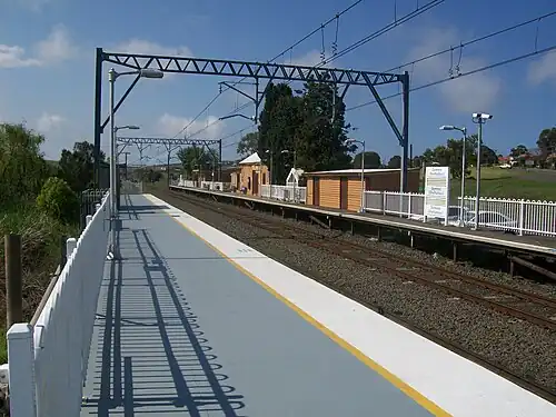 As part of the electrification of the line to Kiama in 2001, the existing crossing loop was extended north and received a platform, albeit built out of scaffolding materials with most trains continuing to use the original platform.[5] The loop also provides access to Boral's Dunmore Quarry. There was previously a level crossing immediately south of the station. This was closed in the late-2000s as part of improvement works to the adjacent Princes Highway.[6]