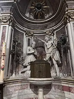 The baptistery has two statues, one of Jesus being baptised, and one of Saint John the Baptist, baptising Jesus[6].