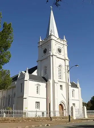 The Dutch Reformed Church in Bethulie is a congregation of the Dutch Reformed Church[1] in the South Free State which was founded in 1862 as the 10th congregation of the Church in the Orange Free State and almost the 85th in the Church.[2] It is located in the Presbytery of Smithfield, together with the parishes of Smithfield, Edenburg, Rouxville, Wepener, Dewetsdorp, Zastron, Reddersburg and Vanstadensrus. In 2015, Bethulie had 479 professing and 137 baptized members and the Presbytery 3,006 and 844 respectively.[3]
