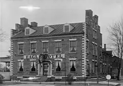 The Eagle Hotel was constructed in 1826 by Thomas King. It was built at a time when "plank road, turnpikes, canals and later railroads went through or near Waterford." Also, the Waterford was used as a "terminal and distribution point" for the developing salt industry in New York.[4] The Eagle Hotel was documented by the Historic American Buildings Survey (HABS) in 1933.[5] The hotel was listed on the National Register of Historic Places on November 28, 1977.[1] The hotel was purchased by the Fort Le Boeuf Historical Society to preserve it and to prevent it from being demolished. The Eagle Hotel was renovated and the kitchen modernized from October 1997 to February 1998.[6] A restaurant was opened in the hotel but closed several months later. In October 1998, the Eagle Hotel was leased by the owners of the Sugar 'n Spice in Titusville, Pennsylvania to open another location of the restaurant in the hotel.[7] The hotel was designated a contributing property to the Waterford Borough Historic District on March 9, 1990.[8]