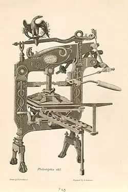 In 1660, Marmaduke Johnson was sent over from England to work with Samuel Green in the printing of a Bible translated into an Indian language by John Eliot.[75][76] When this enormous task was completed Johnson returned to England, and within a year came back to the colonies with his own printing press with the intention of starting his own private enterprise. Laws requiring the Court approval and licensing had been repealed, but upon Johnson's return they were reinstated with Johnson specifically in mind. After several failed appeals to the Court, they finally conceded to his wishes, with a few restrictions in place,[77] allowing Johnson in 1674 to become the first printer in the American colonies to operate his own press. Unfortunately Johnson died shortly thereafter that same year and never fulfilled that dream. John Foster bought Johnson's equipment and became the first printer to produce a woodcut (of Richard Mather) in the American colonies and began to produce work on a privately operated press.[78][79]