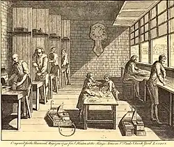 In 1752, Samuel Kneeland and his partner Bartholomew Green, commissioned by Daniel Henchman, printed an edition of the King James Bible that was the first Bible printed in America in the English language. As the British Crown owned the printing rights it was illegal to print this Bible in America.[102] Subsequently, the printing was conducted as privately as possible and bore the London imprint from which it was copied, to avoid prosecution and detection of the unauthorized printing.[103] In the process Kneeland was printing the first Bible ever produced from the Boston Press.[104]