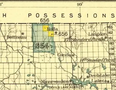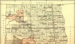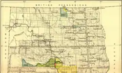 The areas combined indicates a reserve for the Chippewa (Turtle Mountain band) established on December 21, 1882, by executive order.[1]: 908–909 Two years later the major part of it was relinquished by executive order of March 29, 1884.[1]: 916–917 The diminished reserve for the Turtle Mountain Chippewa is shown as two yellow survey townships. Within three months, the "President amends Executive order of Mar. 29, 1884" with its far from practical division of the reserve. The executive order of June 3, 1884, made the reserve a whole (the southern half of the reserve was moved one survey township westward – not shown on the map).[1]: 916–917