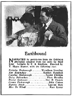 Earthbound is an American silent drama film from Goldwyn Pictures Corporation that was released on August 11, 1920. The film was written by Edfrid A. Bingham from a story by Basil King, and directed by T. Hayes Hunter. Earthbound was produced by Basil King with cinematography by André Barlatier, film editing by J.G. Hawks and art direction from Cedric Gibbons.[1]