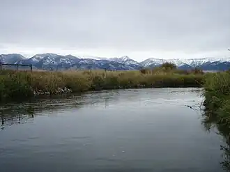 The East Gallatin River flows 42 miles (68 km) in a northwesterly direction through the Gallatin valley, Gallatin County, Montana. Rising from the confluence of Rocky Creek and several other small streams, the East Gallatin begins about one mile (1.6 km) east of downtown Bozeman, Montana. The river joins the main stem of the Gallatin River 2.3 miles (3.7 km) north of Manhattan, Montana. Throughout its course, the river traverses mostly valley floor ranch and farm land with typical summer flows of approximately 50 cu ft/s (1.4 m3/s).[4]