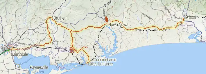 The trail continues to the small town of Nowa Nowa where it diverts through the town, departing from the former railway route.[2] It runs onto an old section of the highway and down to the Lakes Entrance Road, where it then turns sharply onto a concrete path through the town. The path takes an underpass below the highway and leaves town after crossing a bridge over Boggy Creek, finally rejoining the original railway route beyond the east side of the town.[6]