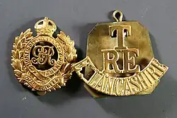 The enthusiasm for the Volunteer movement following an invasion scare in 1859 saw the creation of many Rifle, Artillery and Engineer Volunteer units composed of part-time soldiers eager to supplement the Regular British Army in time of need.[2][3] One such unit was the 3rd Lancashire Engineer Volunteer Corps (EVC), formed at Manchester in July 1862 and attached to the 19th Lancashire Artillery Volunteers. However, no officers were gazetted to the new unit, which disappeared by October the same year.[4] Another 3rd Lancashire EVC was formed at St Helens on 13 February 1864, but by April the same year it was renumbered 2nd, taking the place of a small unit that had been absorbed by the 1st Lancashire EVC.[4][5]
