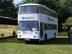This distinctive style of bodywork has a downward-sloping front window bay on the upper deck, with both top and bottom edges angled downwards. The side windows are square-cornered. A large double-curvature upper deck windscreen (either single-piece or two-piece) is one of the most distinctive features.