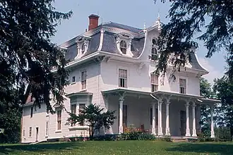The Capt. John McGilvery House stands at the northeast corner of US 1 and Black Road, set back from the road. It is a three-story wood frame structure, with a mansard roof characteristic of the Second Empire style. The house and its associated carriage barn both have bracketed and denticulated cornices, and have roofs studded with pedimented dormers. McGilvery (1829-1904) was a hugely popular ship's captain who is reported to have never lost a vessel. To this house's right stands the Capt. Jonathan C. Nickels House, an Italianate 2-1/2 story house, to which later Stick style and Queen Anne decorations have been applied. Like the McGilvery House, it has paired brackets in the eaves, but Stick style ornamentation has been added to its gables, and its facade has been finished in part in bands of scalloped shingles. Nickels' family at one time owned the land on which all five houses were built. Flanking his house to the right is the Capt. William McGilvery House, one of central Maine's finest Second Empire mansions. William was one of John's four brothers, all of whom went to sea; in addition to his seafaring, William was a state legislator and a major shipbuilder and landowner on Penobscot Bay.[2]