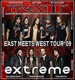 The East Meets West Tour '09 was a concert tour by hard rock band Extreme, taking place in the summer of 2009, in support of their 2008 album Saudades de Rock. It followed the Take Us Alive World Tour in 2008 which was in support of the same album. The tour started with a performance at the M3 Rock Festival on May 30, with the official tour beginning on July 12. This tour was co-headlined with Ratt on almost all dates, excluding New Haven, Springfield and Boston.