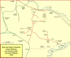 The East and West Yorkshire Union Railway was promoted in 1883 to connect the Hull and Barnsley Railway at Drax with Leeds. The company was unable to raise the money it needed to build the line, and it substantially reduced its scope to connecting collieries around Rothwell with the existing main line network nearby. This was successful, with trains running from 1890, but the company decided it would find a way to connect to Leeds and operate a much truncated passenger service, from Rothwell. It sponsored the South Leeds Junction Railway to make a connection from Rothwell to the Midland Railway at Stourton; the SLJR was soon re-absorbed by the E&WYUR. The passenger service started on 4 January 1904 but it was a disastrous failure, and it was soon withdrawn from 1 October 1904.
