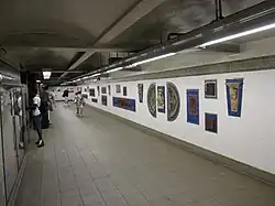 In the eastern mezzanine are architectural ornaments from the Brooklyn Museum collection, installed during the 2003 renovation of the station.[53] The station contains 78 ornaments, which include cornices and statues salvaged from demolished buildings.[33] The platforms and the eastern mezzanine formerly displayed abstract art paintings created in 1991 by artist Pat Steir, collectively called the Brueghel Series.[54]
