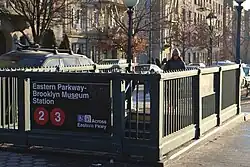 The Eastern Parkway–Brooklyn Museum station is a local station on the IRT Eastern Parkway Line of the New York City Subway. Located at the intersection of Washington Avenue and Eastern Parkway in Brooklyn adjacent to the Brooklyn Museum, it is served by the 2 train at all times, the 3 train at all times except late nights, and the 4 train during late nights.