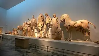 The Eastern pediment of the Temple of Zeus at Olympia depicts the tale of Pelops just before the chariot race[1] wherein he kills the king Oenomaus in order to win the hand of his daughter Hippodamia.[2] The depiction of this chariot race on the east pediment of the Temple of Zeus at Olympia, along with that of the Twelve Labours of Heracles on the metopes of the frieze, relate to the location of the temple in Olympia; the chariot race and Heracles were both believed to have started the tradition of the Olympic Games.[3]