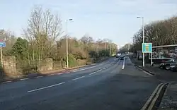![]() View looking north towards Eastwood on Thornliebank Road (B769), with green 'Welcome to Glasgow' sign denoting city boundary | |
