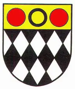 Coat of arms of the former Eastwood urban District Council. The black diamonds represent coal mining, the annulet is from the heraldry of the Plumtree family and the red roundels are from the arms of the Grey family of Codnor.