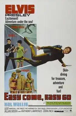 Easy Come, Easy Go is a 1967 American musical comedy film starring Elvis Presley. Hal Wallis produced the film for Paramount Pictures,[4] and it was Wallis' final production with Presley. The film co-starred Dodie Marshall, Pat Priest, Pat Harrington, Jr., Skip Ward, Frank McHugh (in his last feature film) and Elsa Lanchester. The movie reached #50 on the Variety magazine national box office list in 1967.[5]