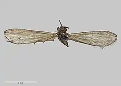 Wise noted that the species could be distinguished from Australian Ecnomina species by the apical forks 3 and 4 of the anterior wing being sessile and not stalked.[3] The larvae are 4.8 mm (0.19 in) in length.[4]