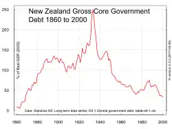 By this time, New Zealand's economy faced serious social problems; the number of New Zealanders estimated to be living in poverty grew by at least 35% between 1989 and 1992;[63] and the economic benefits of privatisation have been questioned.[68] Gross domestic product per capita stagnated between 1986–87 and 1993–94, and by March 1992 unemployment rose to 11.1%[69] Between 1985 and 1992, New Zealand's economy grew by 4.7% during the same period in which the average OECD nation grew by 28.2%.[70] From 1984 to 1993 inflation averaged 9% per year, New Zealand's credit rating dropped twice, and foreign debt quadrupled.[63] Between 1986 and 1993, the unemployment rate rose from 3.6% to 11%.[71]