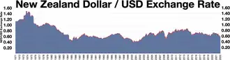In 2013, the economy grew 3.3%. HSBC chief economist for Australia and New Zealand, Paul Bloxham, was so impressed that he predicted New Zealand's growth would outpace most of its peers, and he described New Zealand as the "rock star economy of 2014".[87] Another financial commentator said the New Zealand dollar was the "hottest" currency of 2014.[88] Only three months later, the New Zealand Productivity Commission expressed concern about low living standards and problems affecting the long-term drivers of growth. Paul Conway, Director of Economics and Research at the Productivity Commission, wrote: "New Zealand's broad policy settings should generate GDP per capita 20 per cent above the OECD average, but the actual result is more than 20 per cent below average. We may be punching above our weight, but that's only because we are in the wrong weight division!"[89] In August, Bloxham admitted that "the sharp decline in dairy prices over the last six months has clouded the outlook somewhat".[90] In December however Bloxham stated that he thought the New Zealand economy would continue to grow strongly.[91]
