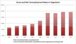 Unemployment was a chronic problem for Yugoslavia.[20] The unemployment rates were among the highest in Europe during its existence, while the education level of the work force increased steadily.[20] The unemployment rate reached 7% in the early 1960s and continued to grow, doubling by the mid-1970s. There were extreme regional differences in unemployment, with the Slovenian rate never exceeding 5%, while Macedonia and Kosovo constantly had rates over 20%.[21] There was also a notable element of gender discrimination in the unemployment rate. When forced to cut workforce, enterprises usually fired women first,[22] expecting that women can be supported by their male family members.[23] Some enterprises also requested that candidates for a job needed to have their military service completed, which excluded women.[24] Female participation rates were lower than in other socialist countries and closer to traditionalist societies of Southern Europe.[22]