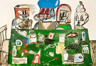 Eddie Martinez (born 1977) is a New York-based artist best known for large-scale paintings that feature bold color, urgent line and brushwork, and graphic shapes and forms.[1][2][3] His style combines painting and drawing, abstraction and representation, and a casual approach to materials with an eclectic iconography of figurative elements.[1][4][5] While contemporary in his choice of materials and subjects, he bridges a wide range of historical influences, including CoBrA, Action painting, neo-expressionism and Philip Guston, and classical conventions of portraiture, still life and allegorical narrative, filtered through the lens of daily experience and popular culture.[6][7][8][9]