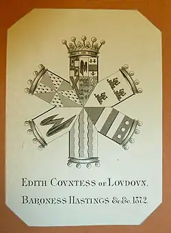 Edith died on 23 January 1874 and was buried in the churchyard at Castle Donington, except for her right hand, which – at her own request – was buried in the parkland of her home at Donington Hall.[8] After she died, the Loudoun monument was erected in Ashby. The octagonal monument by Sir George Gilbert Scott is based on the Eleanor crosses and is now a Grade II* listed structure.[9][10] After Edith's death, her widowed husband was created Baron Donington.