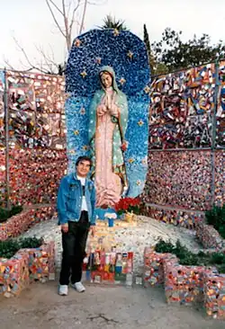 Glenn Green of Glenn Green Galleries portrait of Eduardo Oropeza with his sculpture of the Virgen of Guadalupe at Self Help Graphics Workshop in East LA in 1988