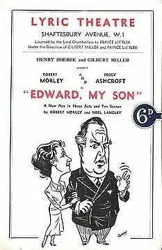 Edward, My Son is a British play written by Noel Langley and Robert Morley. Its original West End run lasted for 782 performance between 30 May 1947 and 23 April 1949, initially at His Majesty's Theatre and then at the Lyric Theatre.[1] The play portrays the moral decline of a business tycoon, Sir Arnold Holt, who has worked his way up from humble beginnings. Holt's efforts for social advancement are driven by his desire to provide the best for his only son, Edward of the title, who never actually appears.