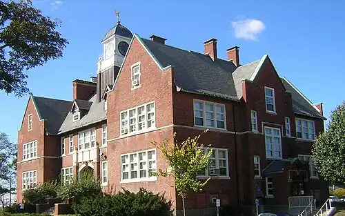 The Edward B. Newton School is a historic school building at 131 Pauline Street in Winthrop, Massachusetts. It is a large H-shaped 2+12-story brick Tudor Revival building, set on the north side of Pauline Street in central Winthrop. It was designed by William M. Bacon and built in 1908.[2] It was named after Edward B. Newton, a longtime Winthrop resident who was a member of the school committee for 17 years, who donated funds for the clock.