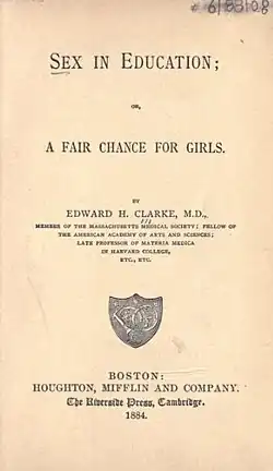 Clarke shared his views on education for women when he was invited to speak at the New England Women's Club of Boston in 1872.[5] Although he claimed that women should be allowed to learn whatever they could, he doubted women had the same ability to succeed as men. In fact, he believed that women's educational capacity was limited by their physiology. The members of the Women's Club were shocked by Clarke's contention about the alleged intrinsic inferiority of women's potential for education compared to men.[5]