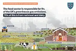 Food systems are both a driver of climate change and are also extremely vulnerable to the impacts of climate change. With rising temperatures and worse weather projected by 2100, the nutrient content and yields of crops will likely be affected.[12] UK agriculture might initially benefit by extended growing seasons, but ongoing heating trends and increased extreme weather events will likely strain domestic food production. Domestic supply may drop especially for volatile crops such as fruit and vegetables, which has already reduced by at least 20% since the 1980s.[67] Increased pest pressure may also reduce yields for key crops, potentially intensifying reliance on imports, especially given the rise in demand for tropical fruits. The UK already heavily relies on imported foods from nations vulnerable to climate impacts, with 78% of its fruits and vegetables sourced from these regions. Climate-related sensitivity in exporting countries can disrupt supply chains, leading to shortages and price spikes in the UK. Such disruptions could particularly impact the availability of fruits, vegetables, and whole grains, which are crucial for a healthy diet, leading to issues in food access, affordability, and ultimately, food insecurity.[12][67]