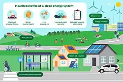 Achieving net zero can have positive effects on health as proposed policy actions would lead to reduced air pollution, increased physical activity, and improved diet.[108][109] A combination of emission reduction policies related to electricity generation, transport, home energy, active travel, and diets are predicted to result in British people gaining 2 million more cumulative life-years by 2050.[108]